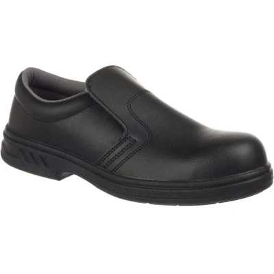 Presenting the Portwest Steelite Slip-On Safety Shoe S2 in Black, designed specifically for professionals in the medical, food, and cleanroom industries. This exceptional footwear combines style with robust protection, ensuring your feet remain safe without sacrificing aesthetics or comfort.
