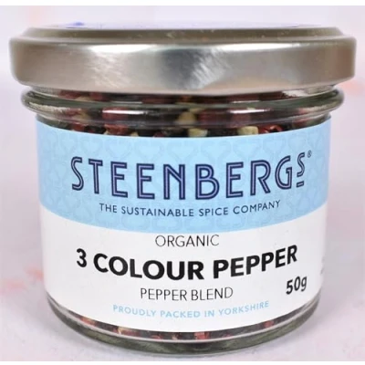Steenbergs Organic 3 Colour Peppercorn Mix Standard Jar 50g glass jar easily recyclable or reusable Blended and Packed by Steenbergs in North Yorkshire, UK, B-Corp cerified Steenbergs The Sustainable Spice Company