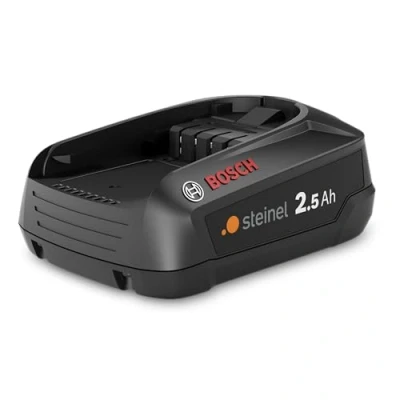 POWER FOR ALL Alliance from Bosch Home & Garden: This battery can be used across manufacturers for over 100 18V POWER FOR ALL tools. Compatible with Steinel MG 3011 cordless glue gun. Approx. 100 minutes running time for gluing work on a single charge. High-efficiency LiHD technology for maximum performance and durability even in demanding applications. Box contents: PFA battery 18V 2.5Ah | Battery voltage: 18V; Battery capacity: 2.5Ah; Battery type: Li-ion; Dimensions (L x W x H): 114 x 81 x 45 mm | Net weight: 0.365 kg