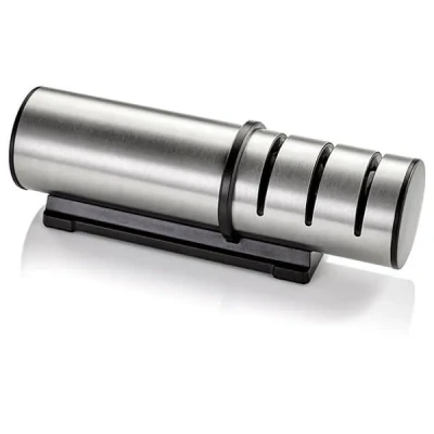 Use the Stellar 3 Stage Diamond Knife Sharpener to keep your knives sharp for optimal kitchen performance.This sharpener ensures your knives are always ready for action, delivering exceptional results whether you are a home cook or a professional chef. The user-friendly design accommodates both left and right-handed users, making it accessible for everyone. Its stylish brushed steel finish adds a modern touch to your kitchen decor.Featuring two diamond abrasive wheels and a ceramic disc, this 3-stage solution offers coarse sharpening and fine honing. The quick and safe operation is enhanced by a non-slip stand, ensuring stability while you sharpen. The coarse 360 grit wheel is perfect for blunt knives, while the fine 600 grit wheel provides post sharpening honing. For daily maintenance, the ultra-fine ceramic wheel keeps your knives in top condition.Dimensions: 19(L) x 5(W) x 6(H) cm.Weight: 0.32kg.Supplied with a manufacturer's lifetime guarantee.Not suitable for serrated blade or scissors.