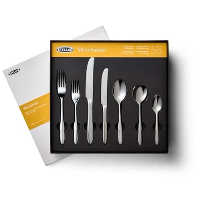 8 x Table Knife8 x Table Fork8 x Dessert Knife8 x Dessert Fork8 x Dessert Spoon8 x Soup Spoon8 x Teaspoon2 x Serving SpoonBeautifully crafted from highly polished 18/10 stainless steel, Stellar Winchester Cutlery is classically designed to be appealingly distinctive in a table setting. Carrying the Stellar Lifetime Guarantee, Stellar Winchester Cutlery is easy to care for - the high grade stainless steel will keep its sparkling finish long into the future, and is dishwasher safe.  Knives are not for sale to persons under the age of 18. - all knives and bladed products are delivered by Age Verified Delivery (AVD). The carrier may request proof of age in order to deliver your parcel. If proof of age is not available, or the recipient is underage, the carrier will refuse to deliver.