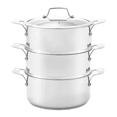 The Stellar 3 Tier 20cm Steamer Set has 4 interchangeable pieces that can be used in any configuration - 2 steaming tiers, base pan and a vented glass lid.This steamer is suitable for ALL hob types including induction and has efficient thermic bases for even heat distribution.Premium stainless steel with branded cast stainless steel handles and a vented glass lid to prevent over boiling.Dishwasher and oven safe 240°C.Dimensions: 29(H) x 20(W) x 25(L) cm. Base diameter: 18cm.Supplied with a manufacturer's lifetime guarantee.