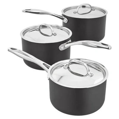 #html-body [data-pb-style=NY6U5H1]{justify-content:flex-start;display:flex;flex-direction:column;background-position:left top;background-size:cover;background-repeat:no-repeat;background-attachment:scroll}Stellar S6A1 6000 Hard Anodised Element 3 Piece Cookware Set BlackOwn your showstoppers For the home chef, cooking is an opportunity to explore, polish, and experiment some more. Make your kitchen your playground. Create your own culinary masterpieces and surprise yourself every time you turn up the heat. Demand more with the Hard Anodised collection Our most durable range Designed to deliver unrivalled performance, for a lifetime: Hardwearing – made with a material twice as durable as steel to stand up to every experiment.Efficient – heat spreads evenly and fast through the base and up the sides for consistent and efficient cooking.Versatile – oven-proof design to suit every style of cooking. Key features Responsive triple-layer non-stick coating for easy hand cleaning Highly resilient hard anodised construction Dark charcoal finish to complement the contemporary kitchen Code: S6A1Contents: 16/18/20cm saucepansMaterial: Aluminium 16cm Saucepan Height: 13.5cm Base Diameter: 14.0cm Capacity: 1.9L 18cm Saucepan Height: 15.0cm Base Diameter: 16.0cm Capacity: 2.9L 20cm Saucepan Height: 16.0cm Base Diameter: 18.0cm Capacity: 3.8L Suitable for Gas, Halogen, Ceramic, & Solid Plate Induction Suitable Oven Safe Up to 210°C