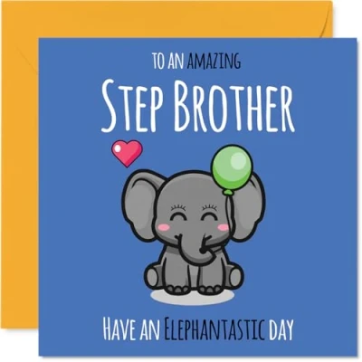 MAKE YOUR STEP BROTHER SMILE WITH THIS UNIQUE BIRTHDAY CARD: This exceptional quality Step Brother birthday card shows the design 'To An Amazing Step Brother Have An Elephantastic Day'. If you are looking for an awesome birthday card for Step Brother, then then this happy birthday Step Brother card is bound to make them smile. Not just a birthday card for Step Brother this could also be a birthday gifts for Step Brother, Brother or Brother in Law. WHAT DO YOU GET: The card is printed on one side and BLANK ON THE INSIDE to allow you to write your very own message. The unique fun design is printed on a specially sourced and environmentally responsible board. At 360 microns thick the natural white one-sided gloss board has a quality look and feel. Supplied with a coloured gummed envelope to complement the design and ready to be sealed and sent in the post. Great Step Brother birthday cards, Brother birthday card. NO INK SMUDGES: There is nothing worse than writing inside a card to find that the shiny surface makes the ink smudge. This is why we use a high quality one sided coated board. The uncoated side will absorb more of the ink from your pen to make smudging a thing of the past. Step Brother birthday cards, Step Brother birthday cards from Sister. SIZES: Greeting Card = 145mm x 145mm, Envelope = 155mm x 155mm, Card Thickness = 360 micron. Happy birthday Step Brother, Step Brothers birthday card, Step Brother cards birthday, birthday card Step Brother, happy birthday Step Brother card, Step Brother gifts from Sister. MADE AND QUALITY CHECKED IN THE UK: We print and manufacture all our products right here in the UK so you can be sure of a fast turnaround and a product that is expertly made. Using environmentally responsible premium board our card is conscious of the responsible management of the world's forests - happy birthday card Step Brother, Step Brother birthday cards.