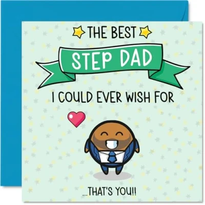 Amazon MAKE YOUR STEP DAD SMILE WITH THIS UNIQUE BIRTHDAY CARD: This exceptional quality Step Dad birthday card for him shows the design 'The Best Step Dad I Could Ever Wish For? That?s You!!'. If you are looking for an awesome birthday card Step Dad for him, then then this happy birthday Step Dad card is bound to make him smile. Not just a birthday card for Step Dad this could also be a birthday gifts for Step Dad, Dad or Father. WHAT DO YOU GET: The card is printed on one side and BLANK ON THE INSIDE to allow you to write your very own message. The unique fun design is printed on a specially sourced and environmentally responsible board. At 360 microns thick the natural white one-sided gloss board has a quality look and feel. Supplied with a coloured gummed envelope to complement the design and ready to be sealed and sent in the post. Great Step Dad birthday cards, Dad birthday card. NO INK SMUDGES: There is nothing worse than writing inside a card to find that the shiny surface makes the ink smudge. This is why we use a high quality one sided coated board. The uncoated side will absorb more of the ink from your pen to make smudging a thing of the past. Step Dad birthday cards, Step Dad birthday cards from Son. SIZES: Greeting Card = 145mm x 145mm, Envelope = 155mm x 155mm, Card Thickness = 360 micron. Happy birthday Step Dad, Step Dads birthday card, Step Dad cards birthday, birthday card Step Dad, happy birthday Step Dad card, Step Dad gifts from Son. MADE AND QUALITY CHECKED IN THE UK: We print and manufacture all our products right here in the UK so you can be sure of a fast turnaround and a product that is expertly made. Using environmentally responsible premium board our card is conscious of the responsible management of the world's forests - happy birthday card Step Dad, Step Dad birthday cards.