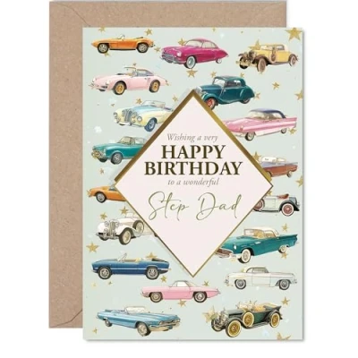 Step Dad Birthday Card Classic Cars Happy for from Son Daughter, A5 Vintage Motors Bday Greeting Cards