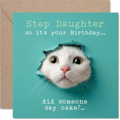 Step Daughter Birthday Card Catty Cake Happy for from Dad Mum, 145mm cute cat humorous Bday Greeting Cards