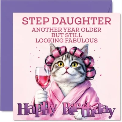MAKE YOUR STEP DAUGHTER SMILE WITH THIS UNIQUE BIRTHDAY CARD: This exceptional quality Step Daughter birthday card for her shows the design 'Step Daughter Another Year Older But Still Looking Fabulous Happy Birthday'. If you are looking for a beautiful birthday card Step Daughter for her, then then this happy birthday Step Daughter card is bound to make her smile. Not just a birthday card for Step Daughter this could also be a birthday gifts for Step Daughter, Daughter or Daughter in Law. WHAT DO YOU GET: The card is printed on one side and BLANK ON THE INSIDE to allow you to write your very own message. The unique fun design is printed on a specially sourced and environmentally responsible board. At 360 microns thick the natural white one-sided gloss board has a quality look and feel. Supplied with a coloured gummed envelope to complement the design and ready to be sealed and sent in the post. Great Step Daughter birthday cards, Daughter birthday card. NO INK SMUDGES: There is nothing worse than writing inside a card to find that the shiny surface makes the ink smudge. This is why we use a high quality one sided coated board. The uncoated side will absorb more of the ink from your pen to make smudging a thing of the past. Step Daughter birthday cards, Step Daughter birthday cards from Dad. SIZES: Greeting Card = 145mm x 145mm, Envelope = 155mm x 155mm, Card Thickness = 360 micron. Happy birthday Step Daughter, Step Daughters birthday card, Step Daughter cards birthday, birthday card Step Daughter, happy birthday Step Daughter card, Step Daughter gifts from Dad. MADE AND QUALITY CHECKED IN THE UK: We print and manufacture all our products right here in the UK so you can be sure of a fast turnaround and a product that is expertly made. Using environmentally responsible premium board our card is conscious of the responsible management of the world's forests - happy birthday card Step Daughter, Step Daughter birthday cards.