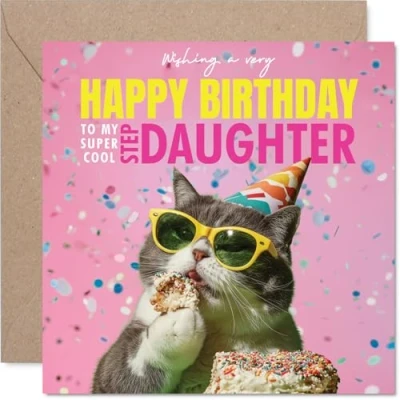 Step Daughter Birthday Card Purr fect Cake Happy for from Dad Mum, 145mm funny cat Bday Greeting Cards