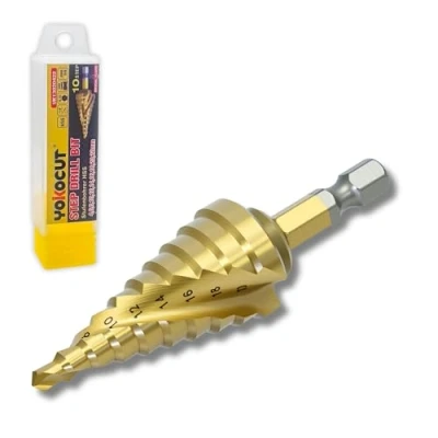 YOKOCUT step drill bits are 100% genuine HSS 4241. 100% Satisfaction Guarantee: Every YOKOCUT product includes 60days money-back & 24-month warranty and a friendly customer service. Perfect Step Drill Bits suitable for drill holes in various material: within 3mm/0.12 inch (Iron Plate, Copper Plate, Aluminum Plate); within 5mm/0.2 inch (Wood, PVC sheet, Insulation Boards). Not suitable for hard and brittle materials such as stainless steel, glass, tile floors, walls etc. HSS combined with a titanium coating. More capable and durable. Two-Spiral Flute Design for smoother cutting. High Step design let you feel the stop and never drill bigger in mistake. HSS Titanium Step Drill Bit (4-22mm ). 6.35mm quick change hex shaft drives are suitable for all kinds of for home DIY power drills.