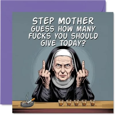 MAKE YOUR STEP MOTHER SMILE WITH THIS UNIQUE BIRTHDAY CARD: This exceptional quality Step Mother birthday card shows the design 'Step Mother Guess how many fucks you should give today? Nun'. If you are looking for an awesome birthday card for Step Mother, then then this happy birthday Step Mother card is bound to make them smile. Not just a birthday card for Step Mother this could also be a birthday gifts for Step Mother, Step Mum or Mum. WHAT DO YOU GET: The card is printed on one side and BLANK ON THE INSIDE to allow you to write your very own message. The unique fun design is printed on a specially sourced and environmentally responsible board. At 360 microns thick the natural white one-sided gloss board has a quality look and feel. Supplied with a coloured gummed envelope to complement the design and ready to be sealed and sent in the post. Great Step Mother birthday cards, Step Mum birthday card. NO INK SMUDGES: There is nothing worse than writing inside a card to find that the shiny surface makes the ink smudge. This is why we use a high quality one sided coated board. The uncoated side will absorb more of the ink from your pen to make smudging a thing of the past. Step Mother birthday cards, Step Mother birthday cards from Son. SIZES: Greeting Card = 145mm x 145mm, Envelope = 155mm x 155mm, Card Thickness = 360 micron. Happy birthday Step Mother, Step Mothers birthday card, Step Mother cards birthday, birthday card Step Mother, happy birthday Step Mother card, Step Mother gifts from Son. MADE AND QUALITY CHECKED IN THE UK: We print and manufacture all our products right here in the UK so you can be sure of a fast turnaround and a product that is expertly made. Using environmentally responsible premium board our card is conscious of the responsible management of the world's forests - happy birthday card Step Mother, Step Mother birthday cards.