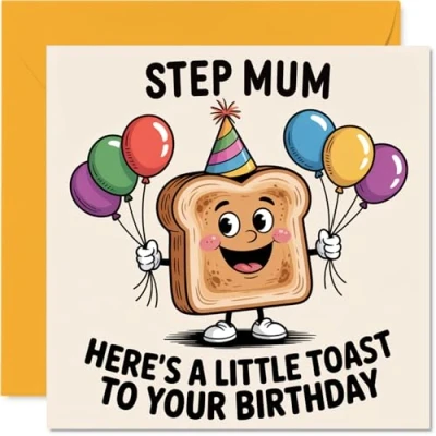 MAKE YOUR STEP MUM SMILE WITH THIS UNIQUE BIRTHDAY CARD: This exceptional quality Step Mum birthday card shows the design 'Step Mum Heres a Little Toast to your Birthday'. If you are looking for an awesome birthday card for Step Mum, then then this happy birthday Step Mum card is bound to make them smile. Not just a birthday card for Step Mum this could also be a birthday gifts for Step Mum, Step Mother or Mum. WHAT DO YOU GET: The card is printed on one side and BLANK ON THE INSIDE to allow you to write your very own message. The unique fun design is printed on a specially sourced and environmentally responsible board. At 360 microns thick the natural white one-sided gloss board has a quality look and feel. Supplied with a coloured gummed envelope to complement the design and ready to be sealed and sent in the post. Great Step Mum birthday cards, Step Mother birthday card. NO INK SMUDGES: There is nothing worse than writing inside a card to find that the shiny surface makes the ink smudge. This is why we use a high quality one sided coated board. The uncoated side will absorb more of the ink from your pen to make smudging a thing of the past. Step Mum birthday cards, Step Mum birthday cards from Son. SIZES: Greeting Card = 145mm x 145mm, Envelope = 155mm x 155mm, Card Thickness = 360 micron. Happy birthday Step Mum, Step Mums birthday card, Step Mum cards birthday, birthday card Step Mum, happy birthday Step Mum card, Step Mum gifts from Son. MADE AND QUALITY CHECKED IN THE UK: We print and manufacture all our products right here in the UK so you can be sure of a fast turnaround and a product that is expertly made. Using environmentally responsible premium board our card is conscious of the responsible management of the world's forests - happy birthday card Step Mum, Step Mum birthday cards.