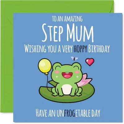 MAKE YOUR STEP MUM SMILE WITH THIS UNIQUE BIRTHDAY CARD: This exceptional quality Step Mum birthday card shows the design 'To an amazing Step Mum Wishing you a very hoppy birthday. Have an unfrogetable day'. If you are looking for a beautiful birthday card Step Mum, then then this happy birthday Step Mum card is bound to make them smile. Not just a birthday card for Step Mum this could also be a birthday gifts for Step Mum, Step Mother or Mum. WHAT DO YOU GET: The card is printed on one side and BLANK ON THE INSIDE to allow you to write your very own message. The unique fun design is printed on a specially sourced and environmentally responsible board. At 360 microns thick the natural white one-sided gloss board has a quality look and feel. Supplied with a coloured gummed envelope to complement the design and ready to be sealed and sent in the post. Step Mum Mothers Day cards, Step Mother birthday cards, Mum birthday card. NO INK SMUDGES: There is nothing worse than writing inside a card to find that the shiny surface makes the ink smudge. This is why we use a high quality one sided coated board. The uncoated side will absorb more of the ink from your pen to make smudging a thing of the past. Step Mum birthday cards, Step Mum birthday cards from Son. SIZES: Greeting Card = 145mm x 145mm, Envelope = 155mm x 155mm, Card Thickness = 360 micron. Happy birthday Step Mum, Step Mums birthday card, Step Mum cards birthday, birthday card Step Mum, happy birthday Step Mum card, Step Mum gifts from Son. MADE AND QUALITY CHECKED IN THE UK: We print and manufacture all our products right here in the UK so you can be sure of a fast turnaround and a product that is expertly made. Using environmentally responsible premium board our card is conscious of the responsible management of the world's forests - happy birthday card Step Mum, Step Mum birthday cards.