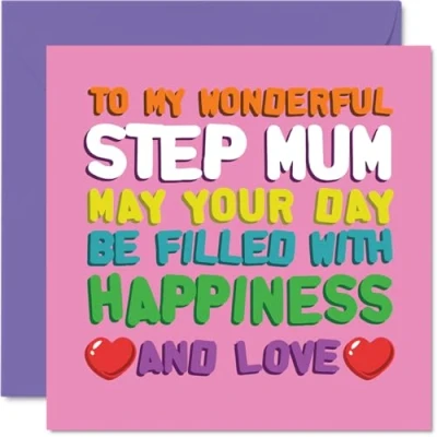 MAKE YOUR STEP MUM SMILE WITH THIS UNIQUE BIRTHDAY CARD: This exceptional quality Step Mum birthday card for her shows the design 'To my wonderful Step Mum may your day be filled with happiness and love'. If you are looking for a beautiful birthday card Step Mum for her, then then this happy birthday Step Mum card is bound to make her smile. Not just a birthday card for Step Mum this could also be a birthday gifts for Step Mum, Step Mother or Mum. WHAT DO YOU GET: The cards are printed on both sides with the inside print saying 'Have a Great Day' and ample space for your own personal message. The unique fun design is printed on a specially sourced and environmentally responsible board. At 360 microns thick the natural white one-sided gloss board has a quality look and feel. Supplied with a coloured gummed envelope to complement the design and ready to be sealed and sent in the post. NO INK SMUDGES: There is nothing worse than writing inside a card to find that the shiny surface makes the ink smudge. This is why we use a high quality one sided coated board. The uncoated side will absorb more of the ink from your pen to make smudging a thing of the past. Step Mum birthday cards, Step Mum birthday cards from Son. SIZES: Greeting Card = 145mm x 145mm, Envelope = 155mm x 155mm, Card Thickness = 360 micron. Happy birthday Step Mum, Step Mums birthday card, Step Mum cards birthday, birthday card Step Mum, happy birthday Step Mum card, Step Mum gifts from Son. MADE AND QUALITY CHECKED IN THE UK: We print and manufacture all our products right here in the UK so you can be sure of a fast turnaround and a product that is expertly made. Using environmentally responsible premium board our card is conscious of the responsible management of the world's forests - happy birthday card Step Mum, Step Mum birthday cards.