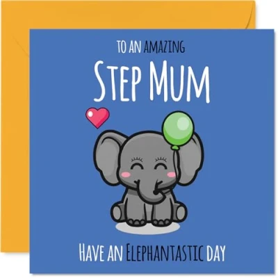 MAKE YOUR STEP MUM SMILE WITH THIS UNIQUE BIRTHDAY CARD: This exceptional quality Step Mum birthday card shows the design 'To An Amazing Step Mum Have An Elephantastic Day'. If you are looking for an awesome birthday card for Step Mum, then then this happy birthday Step Mum card is bound to make them smile. Not just a birthday card for Step Mum this could also be a birthday gifts for Step Mum, Step Mother or Mum. WHAT DO YOU GET: The card is printed on one side and BLANK ON THE INSIDE to allow you to write your very own message. The unique fun design is printed on a specially sourced and environmentally responsible board. At 360 microns thick the natural white one-sided gloss board has a quality look and feel. Supplied with a coloured gummed envelope to complement the design and ready to be sealed and sent in the post. Great Step Mum birthday cards, Step Mother birthday card. NO INK SMUDGES: There is nothing worse than writing inside a card to find that the shiny surface makes the ink smudge. This is why we use a high quality one sided coated board. The uncoated side will absorb more of the ink from your pen to make smudging a thing of the past. Step Mum birthday cards, Step Mum birthday cards from Son. SIZES: Greeting Card = 145mm x 145mm, Envelope = 155mm x 155mm, Card Thickness = 360 micron. Happy birthday Step Mum, Step Mums birthday card, Step Mum cards birthday, birthday card Step Mum, happy birthday Step Mum card, Step Mum gifts from Son. MADE AND QUALITY CHECKED IN THE UK: We print and manufacture all our products right here in the UK so you can be sure of a fast turnaround and a product that is expertly made. Using environmentally responsible premium board our card is conscious of the responsible management of the world's forests - happy birthday card Step Mum, Step Mum birthday cards.