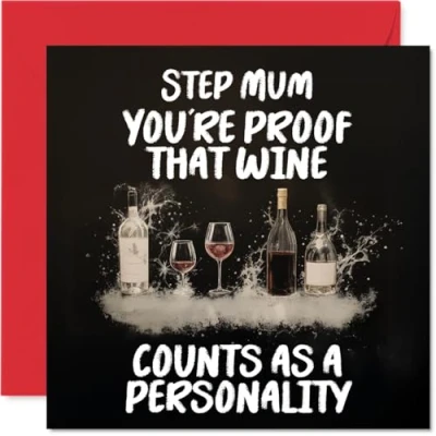 MAKE YOUR STEP MUM SMILE WITH THIS UNIQUE BIRTHDAY CARD: This exceptional quality Step Mum birthday card for her shows the design 'Step Mum Youre proof that wine counts as a personality'. If you are looking for a beautiful birthday card Step Mum for her, then then this happy birthday Step Mum card is bound to make her smile. Not just a birthday card for Step Mum this could also be a birthday gifts for Step Mum, Step Mother or Mum. WHAT DO YOU GET: The card is printed on one side and BLANK ON THE INSIDE to allow you to write your very own message. The unique fun design is printed on a specially sourced and environmentally responsible board. At 360 microns thick the natural white one-sided gloss board has a quality look and feel. Supplied with a coloured gummed envelope to complement the design and ready to be sealed and sent in the post. Great Step Mum birthday cards, Step Mother birthday card. NO INK SMUDGES: There is nothing worse than writing inside a card to find that the shiny surface makes the ink smudge. This is why we use a high quality one sided coated board. The uncoated side will absorb more of the ink from your pen to make smudging a thing of the past. Step Mum birthday cards, Step Mum birthday cards from Son. SIZES: Greeting Card = 145mm x 145mm, Envelope = 155mm x 155mm, Card Thickness = 360 micron. Happy birthday Step Mum, Step Mums birthday card, Step Mum cards birthday, birthday card Step Mum, happy birthday Step Mum card, Step Mum gifts from Son. MADE AND QUALITY CHECKED IN THE UK: We print and manufacture all our products right here in the UK so you can be sure of a fast turnaround and a product that is expertly made. Using environmentally responsible premium board our card is conscious of the responsible management of the world's forests - happy birthday card Step Mum, Step Mum birthday cards.