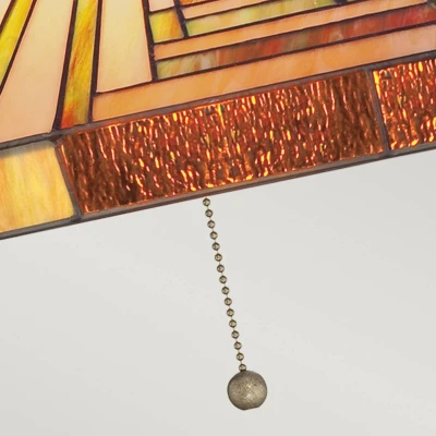 This hand-crafted Tiffany style 3 light ceiling pendant is a stunning addition to any home, intricately designed to illuminate your space with charm and elegance. The light fixture showcases a medley of warm shades, including amber, bisque, and earthy green, all beautifully arranged in a clean geometric pattern. This design takes inspiration from the works of renowned architect Frank Lloyd Wright, translating his artistic vision into a functional yet decorative lighting solution.