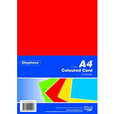 CREATIVITY Great for card making, printing, scrapbook layouts, certificate, copier and printer machine, cut out, layer, embellish, and add a textured look to craft projects for a level of dimension CONTENTS Pack contains 8 assorted coloured sheets of A4 210gsm, 4 colours, high quality cardstock.Add glitter and embellishments to your card for a touch of sparkle and shine IDEAL Can be used for painting, writing, making a poster, postcards, business cards, handmade cards, invitation for birthday, wedding, Christmas cards and more USE Bright coloured card is suitable for use in the home, office, and school, for general use, art, hobbies and craft. Suitable for some printing and copier machine BRAND Comprehensive range offering a wide variety of basic craft, high-quality paper, and stationery products, all at accessible price points. Stephens brings together a wealth of experience and expertise to deliver these essentials