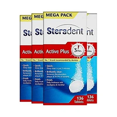Take the hassle out of denture maintenance with Steradent Active Plus, available in a convenient pack of 136 tablets, ensuring you have sufficient supply for ongoing care. Always read the instructions before use to ensure safe and effective cleaning.