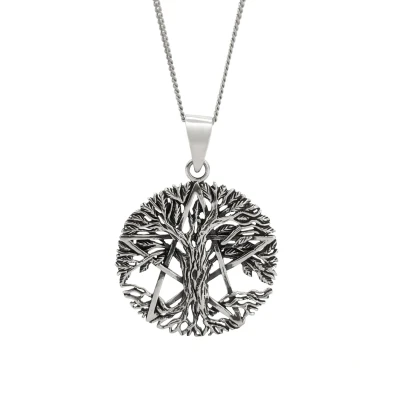 Sterling Silver Round Wicca Tree of Life Pentacle Pendant Necklace