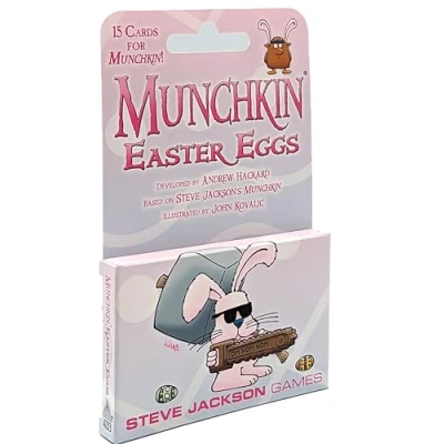 Easter-Themed Munchkin Expansion: Munchkin Easter Eggs is a 15-card booster pack designed to infuse your Munchkin game with delightful Easter-themed cards. Festive Card Design: The booster features seven Treasures and eight Doors with a unique aesthetic, sporting a green border and yellowish background for Treasures and a light blue border with a red and white background for Doors. Whimsical Humor: Immerse yourself in the festive spirit with these cards that inject a good dose of humor into your Munchkin gameplay. Kill the monsters - Steal the treasure - Stab your buddy." Munchkin is a family of games designed by Steve Jackson with a simple premise: reach level 10. Each derived game or expansion is compatible with all other games in the family, and thus integrate without issue., Manufacturer: Steve Jackson Games