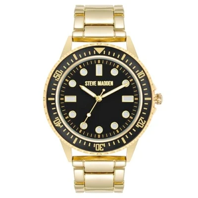 Textured bezel; mineral crystal lens Matte black dial with white filled gold-tone hands, markers and outer minute track Gold-tone adjustable link bracelet; double locking fold over clasp Not water resistant