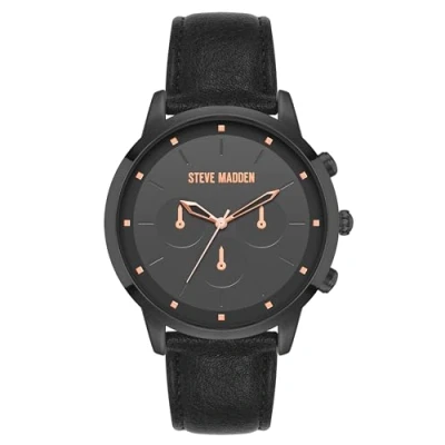 Mineral crystal lens Matte gunmetal grey dial with non-functional subdials; debossed markers and rose gold-tone hands Black faux leather strap with buckle closure Not water resistant