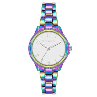 Textured bezel; mineral crystal lens Silver-tone dial with matching white filled hands and markers Iridescent rainbow adjustable link bracelet; double locking fold over clasp Not water resistant