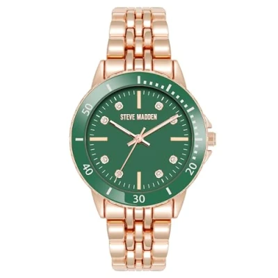 Mineral crystal lens Green glossy dial with white filled rose gold-tone hands and genuine crystal accented markers; white outer minute track Rose gold-tone adjustable link bracelet; double locking fold over clasp Not water resistant