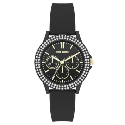 Bezel set with 120 clear genuine crystals; mineral crystal lens Black glossy dial with non-functional subdials; white filled gold-tone hands and markers; white outer minute track Subdials are featured for design purposes and are not operational Black silicone strap with buckle closure Not water resistant