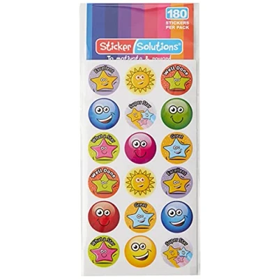 180 x 25mm reward stickers per pack. These stickers have cute smiley faces and adorable hopping stars in a variety of colours. 10 identical sticker sheets per pack with 18 stickers on each sheet. These stickers are a great size for adding to childrens' workbooks or a sticker chart. 9 different sticker designs per pack. Some are captioned with messages such as 'Well Done', 'Excellent' and 'Great', others have no caption. Ideal merit stickers for teachers at school to brighten up marking and incentivise the children. Also perfect for reward charts at home to encourage good behaviour. Designed and printed in the UK, these bright and colourful stickers are eye catching student rewards. An excellent way to encourage your kids and brighten up the classroom or home.