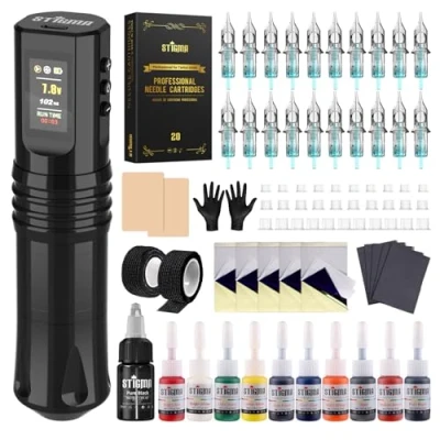 ✐Packing Include: STIGMA Wireless tattoo Kit includes a digital cordless tattoo pen, 20 tattoo cartridge needles, 11 bottles of tattoo ink, 5 sheets of transfer paper, 5 tablecloths, 2 practice skins, 2 rolls of bandages, 30 ink cups and a pair of gloves. ✐The Latest Wireless Tattoo Machine: STIGMA the newest tattoo pen for 2025, large HD digital colour screen, 1800 mAh battery, ultra-powerful motor, O-ring retaining ring, rotating handle to adjust the length of the needle. Simple design, comfortable and senseless, perfect tattoo. ✐One Machine Tattoo Operation: The battery side is equipped with a digital display screen, which can realise a variety of functions such as displaying voltage, battery power, working hours and so on. Three buttons on the side help you pause to switch on the machine and adjust the voltage up and down respectively. ✐20Pcs Sterilized Tattoo Cartridge Needles: STIGMA Tattoo Machine Kit contains 20 Tattoo Cartridge Needles. (1003RLx10pcs, 1201RLx10pcs) All disposable needles have passed CE certification and are pre-sterilized by E.O. Gas. The date indicated on each package provides absolute protection for your tattoo art. ✐Complete Kit Suitable for Beginning: STIGMA complete professional tattoo kit for beginners and tattoo artist. The digital display led screen allows you to check and adjust the voltage at any time. Whether you give it as a gift to others or to yourself, it is a very good choice.