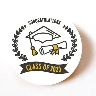 "GRADUATION 2026 DECORATIVE DESIGN: Add a neat, personal touch to gifts, cards and envelopes." "VERSATILE USES: Ideal for party bags, envelopes, jars, gifts, crafts and small business packaging; perfect for everyday projects and events." "SIZE & MATERIAL: 40mm round self-adhesive stickers made from smooth white paper for clean application on dry, smooth indoor surfaces." "PRINT QUALITY: Professionally printed for a sharp, vibrant finish that looks neat and consistent on envelopes, jars and packaging." "CHOOSE YOUR PACK: Available in packs of 24, 72 or 240 — pick the right quantity for personal projects, events or bulk business use."