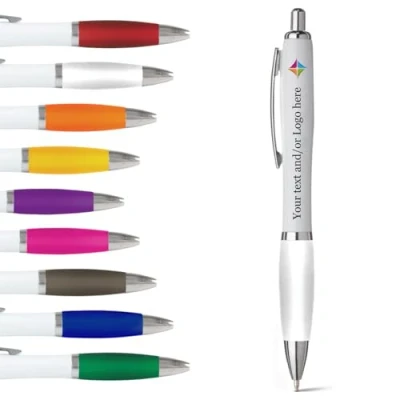 Lightweight push-button biro pen with contrasting chrome accents for a sleek and professional look, making it a standout choice for promotional purposes. The white barrel is complemented by a selection of popular grip colours, allowing for extensive customisation to precisely match your company's unique branding identity. Standard issue with high-quality black ink, making it ideal for various settings including office work, events, and promotional giveaways, ensuring your brand is always presented in the best light. A generously sized printable area of 60 x 70 mm provides ample space for showcasing your logo or message. With a variety of font and colour options available, you can create a truly bespoke writing instrument that represents your brand perfectly. Utilising advanced UV printing technology, our personalised pens offer vibrant, long-lasting colours. This ensures that your brand's message remains impactful, leaving a memorable impression on all who use it.
