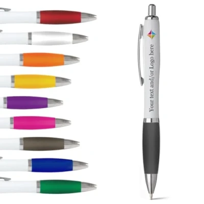 Lightweight push-button biro pen with contrasting chrome accents for a sleek and professional look, making it a standout choice for promotional purposes. The white barrel is complemented by a selection of popular grip colours, allowing for extensive customisation to precisely match your company's unique branding identity. Standard issue with high-quality black ink, making it ideal for various settings including office work, events, and promotional giveaways, ensuring your brand is always presented in the best light. A generously sized printable area of 70 x 7 mm provides ample space for showcasing your logo or message. With a variety of font and colour options available, you can create a truly bespoke writing instrument that represents your brand perfectly. Utilising advanced UV printing technology, our personalised pens offer vibrant, long-lasting colours. This ensures that your brand's message remains impactful, leaving a memorable impression on all who use it. Enhance the Gift: Add a touch of elegance with a high-quality black velvet pouch, making it a truly unique and thoughtful present.