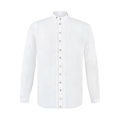 Julian traditional shirt from Bergfeuer in white. The shirt made of high-quality linen is the perfect addition to the traditional costume outfit. This classic model with subtle stand-up collar and piping fits perfectly with your favourite trousers and is indispensable as a combination partner with our traditional vests and jackets. The model is cut in "Comfort Fit" and adapts perfectly to any body shape. The traditional horn buttons give a special touch and skilfully round off the overall picture.
