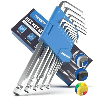 🛠️ 13-PIECE XXL SET METRIC: This comprehensive set of Allen wrenches covers all common sizes from 1.27 mm to 10 mm (including 1.27, 1.5, 2, 2.5, 3, 3.5, 4, 4.5, 5, 6, 7, 8, and 10 mm). Ideal for furniture, bicycles, machinery, and automotive repairs. ⚙️ BALL HEAD FOR ANGLED TURNS: The long side of each hex key is equipped with a precision ball head. This allows for tightening and loosening screws at a working angle of up to 25°. Perfect for hard-to-reach places. 💪 PREMIUM CHROME-VANADIUM STEEL: Made from durable, heat-treated chrome-vanadium steel (CrV). This material guarantees maximum hardness, torque transmission, and dimensional stability. Reliable hand tools for continuous professional use. ✨ RUST PROTECTION (CHROME-PLATED): The high-gloss, nickel-plated surface provides maximum protection against rust and moisture. Easy to clean and perfect for workshops with high standards of cleanliness. 🎁 PLASTIC HOLDER WITH CLICK SYSTEM: The keys come in a practical holder that ensures quick removal and a clear overview of their sizes. Features a hanging loop for easy attachment in the workshop., Weight: 0.220462262 pounds, Manufacturer: STONE REEF