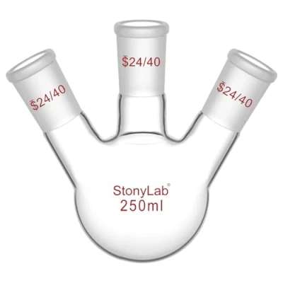 Commonly used for heating, mixing, distillation, reflux, and storage in chemical laboratories Features three necks for simultaneous use of thermometers, condensers, and other lab glassware, making it suitable for complex experimental setups Constructed from high borosilicate 3.3 glass with excellent transparency, resistance to acids, alkalis, and high temperatures, ensuring long-term stability 3 Angled Neck; 250ml capacity; 24/40 Center Joint in the central and double sides Warranty: 1-year coverage period for your peace of mind, if received damaged, please let us know and we will solve it promptly