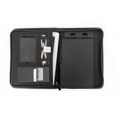 The Stop Ocean Plastic A5 MAUPITI zip folder is made from recycled PET nylon fibres. Sustainable production promotes environmental protection by less plastic in the oceans Stylish anthracite design and compact dimensions of approx. 27.5 x 20 x 2.5 cm make the folder the ideal companion for meetings and business trips Integrated pen loop and 3 business card slots allow for professional working and keep your essentials close at hand Multifunctional compartment and mobile phone/tablet stand offer versatile uses for mobile working and comfortable presentations MAUPITI zip folder with mobile phone or tablet stand, outer dimensions: approx. 27.5 x 20 x 2.5 cm, material: recycled PET, weight: 0.2 kg, colour: anthracite, item no. : 46225, EAN: 4021068462254
