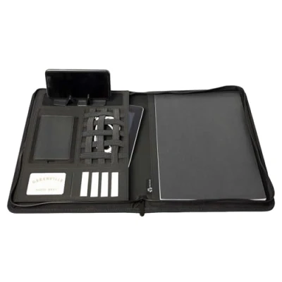 The DIN A4 zip folder stop ocean plastic line is made from recycled PET nylon fibres. Sustainable production promotes environmental protection by less plastic in the oceans The sophisticated conference folder has flexible multifunctional bands on the left side, 1 flexible slip pocket, 5 business card slots, a mobile phone / tablet stand and an A4 slip pocket On the right side there is a DIN A4 writing pad, which is attached in a slip pocket and can be changed easily and an A4 document compartment Ideal for use at work and study, also as a gift idea for many special occasions, such as birthday, confirmation or communion, youth initiation, for the beginning of study or start to work Business folder with zip, outer dimensions: approx. 33.5 x 26.5 x 4 cm, format: DIN A4, weight: 720 g, material: imitation leather and recycled PET, colour: anthracite, item no. : 46220, EAN: 4021068462209