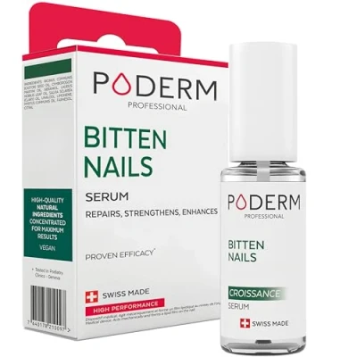 FORTIFIES AND REPAIRS BITTEN NAILS ●● improves the appearance of bitten nails. It forms a protective lipid film that renews the nail and activates growth. Recommended by chiropodists, suitable for adults, children over 3, pregnant women and diabetics. PROFESSIONAL TREATMENT ●● developed by a Swiss podiatrist to repair and beautify bitten nails. SIMPLE USE, FAST RESULTS ●● The bottle is fitted with an applicator brush. Apply to the nail, contours, cuticles, nail bed and grooves, daily morning and evening, then gently massage the oil into the nail and cuticles or allow it to penetrate. NATURAL FORMULATION / SWISS MADE ●● PODERM develops innovative formulations using the therapeutic properties of plants grown without chemicals and distilled to obtain 100% pure and natural essential and plant oils. Manufactured in Switzerland. COMPATIBLE WITH COLOR CARE PODERM NAIL POLISH. ●● PODERM nail polish is enriched with Tea Tree, Biotin and Silicum. They keep your nails healthy and allow the PODERM Serum Oils to penetrate so you can continue to treat one or more damaged nails.
