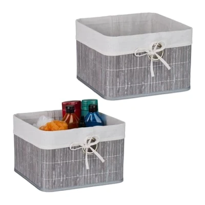 AmazonSet: Baskets for storing various small items - For tidy shelves, cupboards and cabinets Design: Grey baskets made of natural bamboo in a set of 2 - White fabric liner with bow Storage: Bamboo baskets for toiletries, socks, crafts, etc. - Dimensions HxWxD: 20 x 31 x 31 cm Versatile: Use as a bathroom organiser, living room shelf basket, or storage box in the wardrobe With handle: Storage baskets with a practical grip hole - For easy removal from shelves