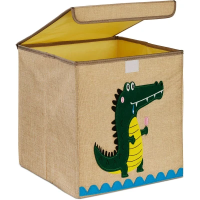 General description This cute toy box features a charming crocodile print design, making tidying up easier for your little ones. It is perfect for storing toys such as building blocks and soft toys, and is an ideal addition to any nursery or children's room. The box can be easily folded flat for convenient storage when not in use, and the lid helps protect the contents from dust. Technical specifications Dimensions (H x W x D): approx. 33 x 33 x 33 cm Interior dimensions (H x W x D): approx. 32 x 32 x 31.5 cm Volume: approx. 30 litres Max. load: approx. 8 kg Weight: approx. 0.7 kg Material: linen, cotton, paper Other information Various design options available Included in delivery: 1x Storage basket in your choice of design (decorative items not included)