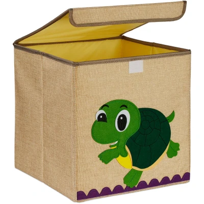 General description This cute toy box features a lovely turtle print design, making tidying up easier for your little ones. It is perfect for storing toys such as building blocks, soft toys, and children's books, and is ideal for use in nurseries or children's rooms. The box includes a convenient lid that protects the contents from dust and can be folded flat for easy storage when not in use. Technical specifications Dimensions (H x W x D): 33 x 33 x 33 cm Interior dimensions (H x W x D): 32 x 32 x 31 cm Volume: 30 litres Max. load: 8 kg Weight: 0.7 kg Material: linen, cotton, paper Other information Various design options available Sturdy fabric storage basket with a great linen look Folds together to save space when not in use