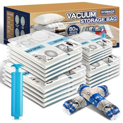 20 BAGS of MULTIPLE SIZES (4 Jumbo, 4 Large, 4 Medium, 4 Small, 4 Small Travel Bags) Vacuum Storage Bags offer a perfect solution for storage, with which you can put away your seasonal clothes, comforters and blankets, pillows and more. Easily create 80% more space! Durable Space Saver Bags: extra flexible and thick premium PA&PE with unique bubbling technique, make these bags ultra durable and re-usable. Secure Vacuum Sealer Bags clothes: these vaccume storage bags have advanced double-zip seal and the triple-seal valve designed to suck every bit of air out and nothing back in. Convenient Space Bag: compatible with any standard vacuum cleaner hose for quick vacuum. A small-sized hand pump is also included, perfect for travel. Extra thick technology provides Storage Master bags extra protection against tear and wear during usage, offering you lighter but more durable vacuum storage bags.