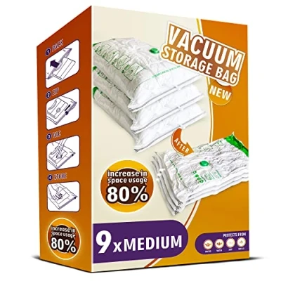 9 x MEDIUM SIZE BAGS Vacuum Storage Bags offer a perfect solution for storage, with which you can put away your seasonal clothes, comforters and blankets, pillows and more. Easily create 80% more space! Durable Space Saver Bags: extra flexible and thick premium PA&PE material, make these bags ultra durable and re-usable. Secure Vacuum Sealer Bags clothes: these vaccume storage bags have advanced double-zip seal and the triple-seal valve designed to suck every bit of air out and nothing back in. Convenient Space Bag: compatible with any standard vacuum cleaner hose for quick vacuum. Please be noted that this combo doesn't include a hand pump. Extra thick film technology provides extra protection against tear and wear during usage, offering you lighter but more durable vacuum storage bags.