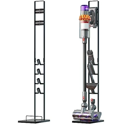 AmazonHigh-quality upright storage organiser for cordless vacuum cleaner & accessories or attachments e.g. docking station, brushes, nozzles, etc. Comfortable storage for more tidiness at home | Keep all your cleaning equipment in one place | Device can be charged even when on the stand Stable, weighted base plate so storage rack remains vertically in place | 4 rubber feet for extra floor protection | Simple design | Portable Freestanding - no drilling necessary | Colour: dark grey | Size: 22 x 29 x 127 cm | Material: aluminium | Weight: 3750 g | Sturdy & space-saving 1x floor stand, assembly material & tools | Easy installation & instant organisation | Vacuum cleaner accessories & spare parts