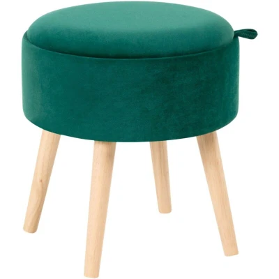 Accent Footstool in Glam Style. Indulge in everyday luxury with this velvet upholstered stool. Its soft, plush surface beckons you to sink in and relax, while the versatile tray top transforms it into a functional small table for your daily needs. With its warm, light wood legs, it seamlessly blends into your living room or bedroom decor. Elevate your everyday living with this storage stool that effortlessly combines style and practicality. Details: Product Type: Stool Style: Boho General Color: Green Shade: Emerald Green Material Type: Fabric Main Material: Velvet Additional Material: Plywood Filling Material: Foam Material Composition: 100% Polyester Shape: Round Pattern: Solid Seat Foam Density: 30 kg/m3 Storage: Yes Dimensions: Depth: 39 cm Width: 39 cm Height: 43 cm Seating Surface: 39x39 cm Weight: 4 kg Weight Capacity: 150 kg Offer Includes: 1 x Stool Key Features: Very Comfortable, Perfect for Both a Bedroom and a Living Room, Elegant Design, High-Quality Upholstery,