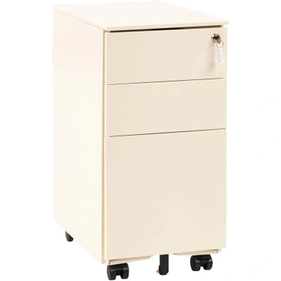 Metal Storage Locker. This metal cabinet is a perfect solution for organizing documents and office supplies. Three shelves provide plenty of storage space, while a practical locker keeps your valuables safe. Made from robust metal, the piece is stable and requires minimal maintenance to serve for many years to come. The cabinet features inbuilt wheels, which make it easily movable from one place to another. Thanks to the minimalist design, this storage cabinet blends well with any interior style. Details: Product Type: Office Cabinet General Color: Beige Shade: Light Beige Material Type: Metal Main Material: Steel Additional Material: Synthetic Material Legs material: Metal Drawers: Yes Finish: Gloss Key Locked: Yes Number of Drawers: 3 Shelves: No Dimensions: Depth: 45 cm Width: 30 cm Height: 60 cm Weight: 16 kg Drawer Weight Capacity: 10 kg Top Weight Capacity: 30 kg Offer Includes: 1 x Storage Unit Key Features: Swivel Castors with Locking Brake, Soft-Close Drawer Runners,