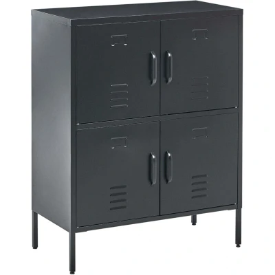 General description This robust metal storage cabinet, with its distinctive locker-style design, adds a touch of industrial flair to any room. It features four separate compartments, each with a door, providing ample and organized storage for files, documents, and other items. The sleek black finish and vents make it a functional and stylish statement piece for a home office or living space. Technical specifications Product Type: Office Cabinet Style: Scandinavian General Color: Black Main Material: Iron Legs Material: Metal Number of Shelves: 4 Number of Doors: 4 Doors Opening: Standard Weight: 25 kg Dimensions: Depth: 40 cm, Width: 80 cm, Height: 101 cm Top Weight Capacity: 30 kg Installation Full assembly required (20-40 min) For safety reasons, the product should be mounted to the wall. Usage Clean with a mild cleaner and soft cloth, wipe dry afterwards. To avoid scratches, do not use abrasive cleaners. For copper or chromed elements, use a polish agent. Other information